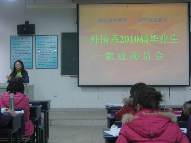 129号日下午,外语系在9J101召开了2010届毕业生就业动员会。会议由毕业班辅导员余本祺主持,系党总支副书记谈丽华、团总支书记李烨、辅导员李飞出席了本次动员会。