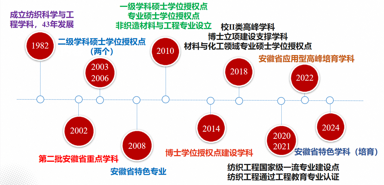 强化学科建设龙头地位,对标博士学位授予点基本条件,加强学科内涵建设。2022年纺织科学与工程学科获批安徽省应用型高峰培育学科,2024年纺织材料学科获批安徽省特色培育学科,2025年纺织科学与工程学科获批安徽省Ⅲ类高峰学科。