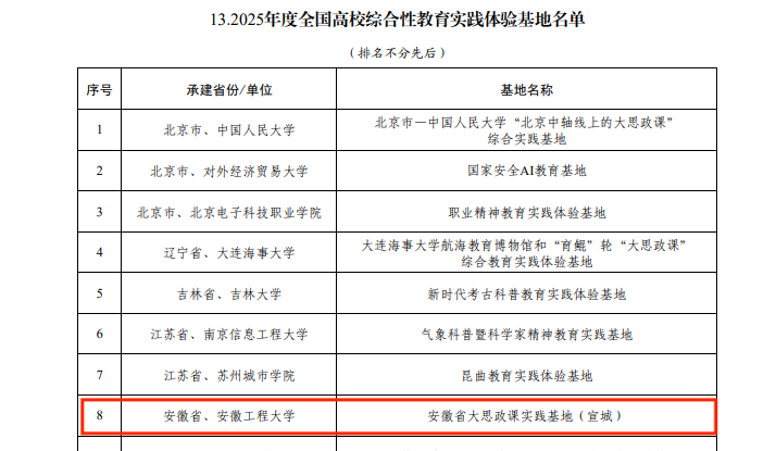 近日,教育部公布2025年度高校思想政治工作质量提升综合改革与精品建设项目入选名单,我校申报的安徽省大思政课实践基地(宣城)成功获批全国高校综合性教育实践体验基地。这是我校连续两年获批教育部精品建设项目。