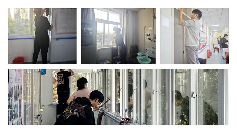 志愿服务队,由支部书记王玲玲老师带队一行14人。清扫工作开始前,指导老师为大家详细介绍了本次活动的具体内容、任务分配及注意事项,特别叮嘱志愿者们在清扫过程中时刻注意自身安全,在安全的前提下,认真细致进行清扫,保质保量做好清扫志愿服务工作。在清扫工作过程中,志愿者们一遍遍擦拭尘灰多年的一个个窗格、一次次认真细致的检查一片片逐渐崭换新颜的玻璃镜片、一幕幕畅想今后中心来访者们一张张真诚的笑脸。志愿者邵佳雯说:“看着窗户一点点地被擦拭干净,也希望那些蒙尘的心窗在这里也能被擦亮。”志愿者张秋妹说:“能够和大家一起为心理健康中心出一份力是一件非常开心的事。”
