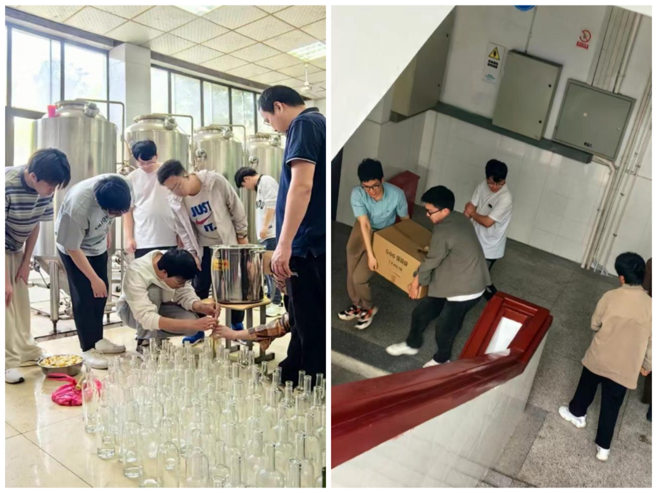 本次劳动教育宣传周特色活动是结合生物工程专业课程,开展的葡萄酒的澄清、过滤、灌装劳动实践活动。活动分为三个环节,灌装的准备工作环节,包括红酒瓶的清洗灭菌、控水晾干;发酵原酒澄清过滤工艺环节,包括板框过滤机的组装、清洗、硅藻土混匀、过滤;澄清酒的灌装工艺环节,包括灌装、封瓶塞、灭菌、储存。同学们互相协作,共同体会劳动的乐趣和成就感。生工211夏洁说:“劳动是成长的必修课,通过这样的劳动教育实践活动,有助于我们更好地将专业理论知识与实践相结合,在劳动者中锤炼本领、增长才干,真正学起来,勤起来,乐起来。”
