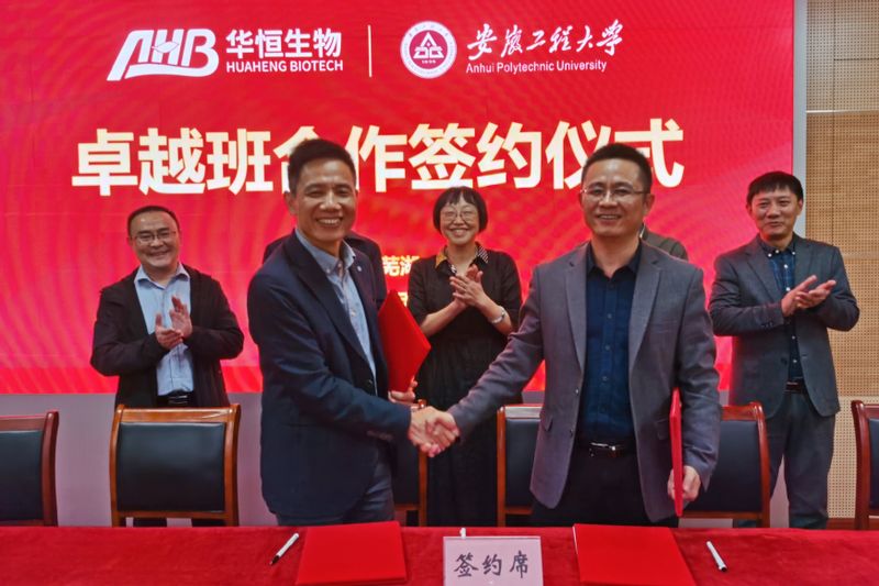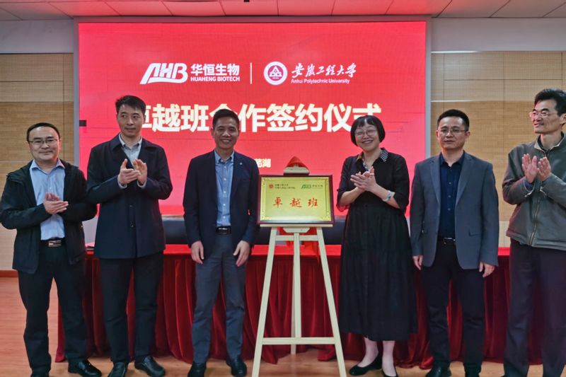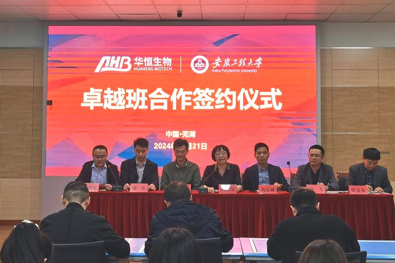 10月21日,学校安徽华恒生物“卓越班”签约启动仪式在生物与食品工程学院虚拟仿真中心举行。安徽华恒生物科技股份有限公司副总裁刘忠诚,学校副校长周虹屏出席,教务处相关负责人,生物与食品工程学院党政领导、各专业负责人、专业教师代表、“卓越班”班主任、卓越班2022级、2023级学生代表参加活动。