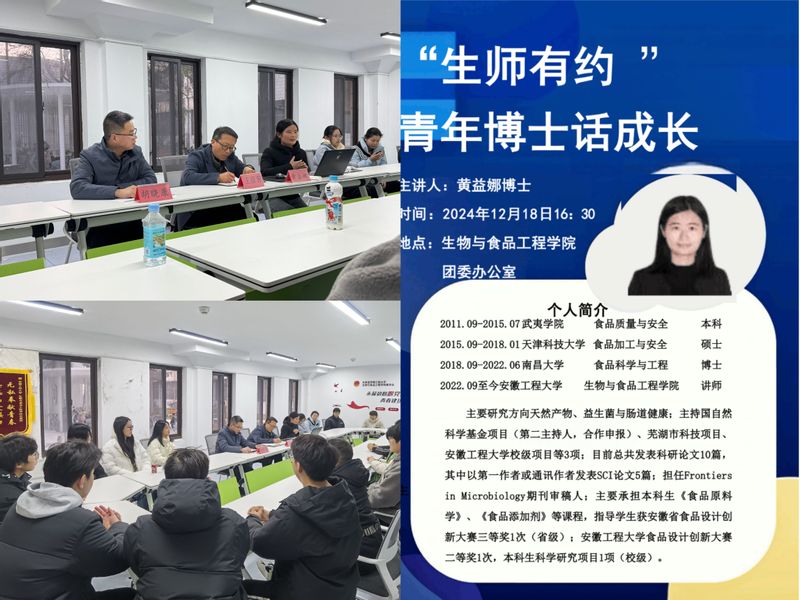 为帮助学生更好地规划职业发展路径,12月18日,生物与食品工程学院在学院团委青年之家举办第七期“生师有约-青年博士话成长”活动。本次活动特邀黄益娜博士作为主讲嘉宾,与学生们面对面交流,分享学术成长与职业规划的宝贵经验。学院党委副书记王彦青、辅导员胡晓康以及20余名学生代表参与了此次活动。